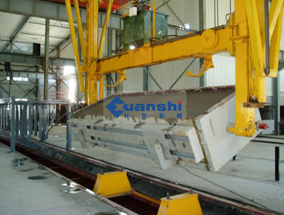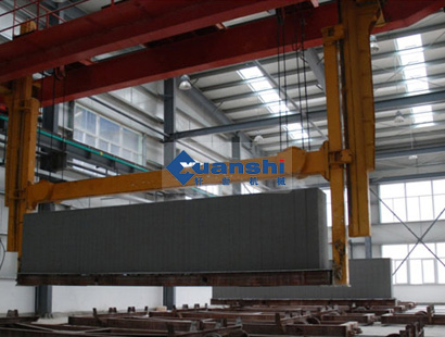 翻轉(zhuǎn)吊具是加氣混凝土生產(chǎn)設(shè)備中主要配套設(shè)備,翻轉(zhuǎn)吊具將坯體(帶模具和側(cè)板)在空中翻轉(zhuǎn)90度,吊放在切割臺或切割小車上,脫去?,坯體即能切割。