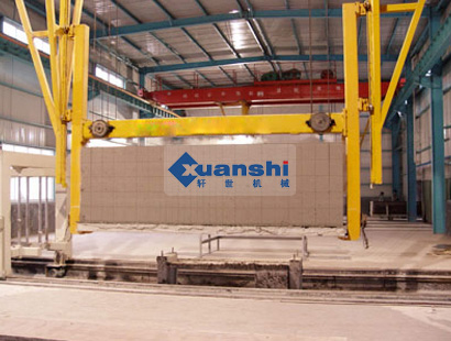 1、將澆注養(yǎng)護后的坯體帶?蚝蛡(cè)板凌空吊起,翻轉(zhuǎn)90度(坯體已直立),吊放至切割臺進行開模、脫模。吊去?,坯體即能切割。