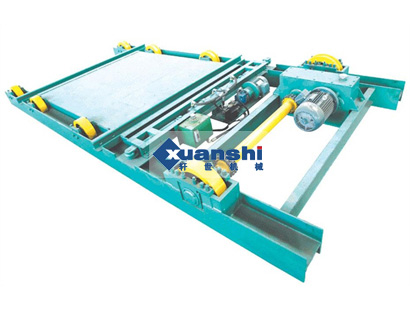 擺渡車是各類蒸養(yǎng)制品廠成型工段連接蒸養(yǎng)工段換向拖動(dòng)不可少的設(shè)備.該車具有拖動(dòng)、頂推強(qiáng)勁有力的特點(diǎn).大車橫向快速移動(dòng)后能夠準(zhǔn)確的停止、定位和接軌,大車載重運(yùn)行時(shí)可變頻慢速運(yùn)行,空車回程時(shí)可變頻快速。擺渡車上還設(shè)有縱向動(dòng)力裝置,可以拖動(dòng)、頂推滿載3噸制品的蒸養(yǎng)小車20輛。