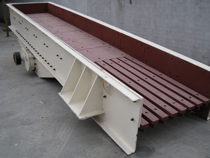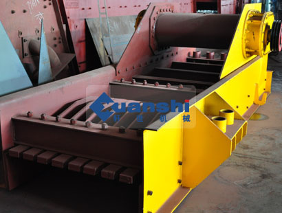 該機采用雙偏心軸激振器的結構特點,保證設備能承受大塊物料下落的沖擊, 給料能力大。在生產(chǎn)流程中可以把塊狀、顆粒狀物料從貯料倉中均勻、定時、連續(xù)地給到受料裝置中去,從而防止受料裝置因進料不均而產(chǎn)生死機的現(xiàn)象,延長了設備使用壽命。給料機可分為鋼板結構和篦條結構,鋼板結構的給料機多用于砂石生產(chǎn)線,將物料全部均勻地送入破碎設備;篦條結構的給料機可對物料進行粗篩分使系統(tǒng)在配制上更經(jīng)濟合理,在破碎篩分中已作為必不可少的設備。